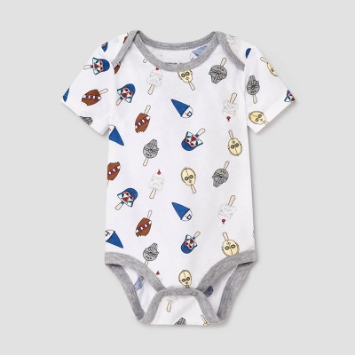 The Force will always be with your little one when you dress them in this 2-Pack Star Wars Romper Set. This outfit set includes one romper and one bodysuit, both crafted from a soft fabric blend for all-day comfy wear. These outfits feature crotch snaps for easy diaper changes, while lap shoulders make dressing a breeze. The gray romper features an illustration of Stormtrooper, C-3PO, Darth Vader and space shuttle-shaped popsicles with the message “May the snacks Be With You” written on the navy kangaroo pocket. The white bodysuit features an allover print of popsicle-style prints of different Star Wars characters. Coordinate them with other separates or accessories from their closet to create an array of fun outfit choices.