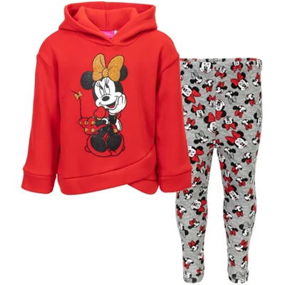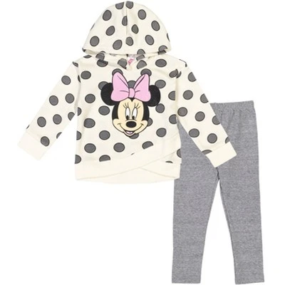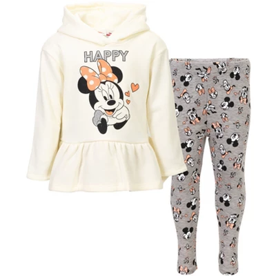 - Featuring Minnie Mouse on this cozy fleece hoodie with ruffles and adorable Minnie screen print design with silver glitter. Leggings feature Minnie and Mickey all-over print with an elastic waist for a better fit