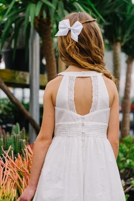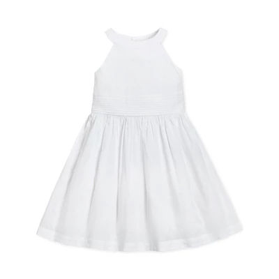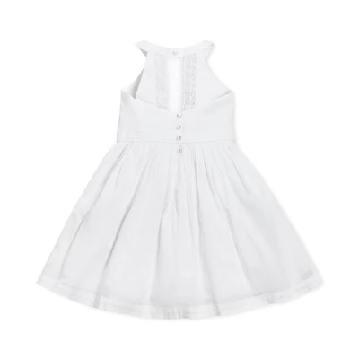 Our super special party dress in soft organic cotton has all the incredible details that make it perfect for everything from dinner with the family to twirling on a dance floor. Features a beautiful halter neckline, pleated waistband, crochet detail at the back bodice opening, and a button closure at the back. A showstopper!