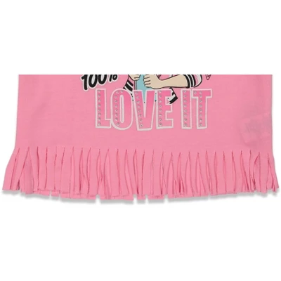 - All over print design; Rib knit crew neck collar; Awesome screen print design; Fashion fringe design; Awesome soft hand screen print with glitter; Elastic waist for better fit; Pull on closure
