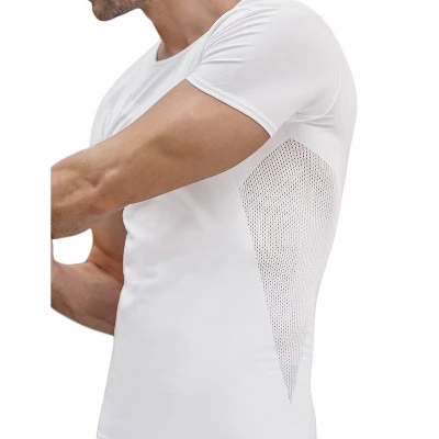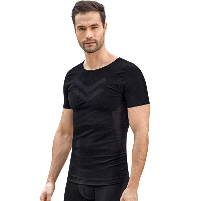 - Men’s sports shirt with seamless compression on the abdominal, chest, and back areas.