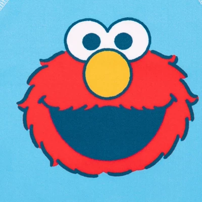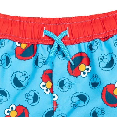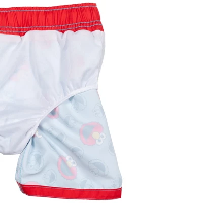 - 4 way stretch swim shirt featuring iconic Elmo and short paired with comfortable all-over cartoon print swimming shorts