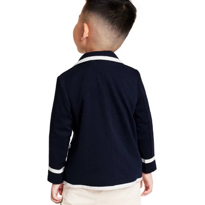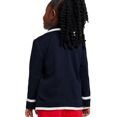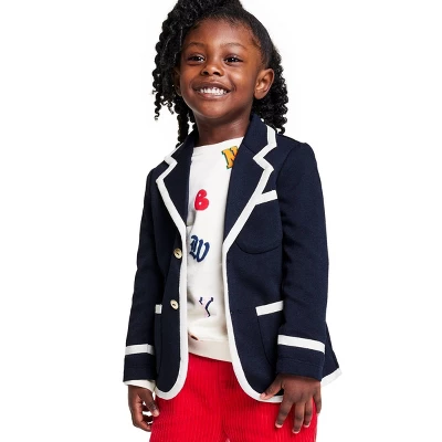 Add color and classic style to your little one’s day with this Button Blazer from Rowing Blazers x Target. This midweight blazer is made with recycled polyester fabric with added spandex for comfort, and it comes in navy with crisp white grosgrain trim. The below-waist blazer boasts two gold-tone front buttons, a notched collar, and fun bias stripe lining.